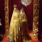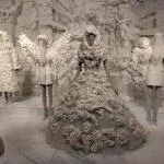 L’eccesso non è mai fastidioso nemmeno in una delle sale successive, quella in cui sono esposte alcune delle maestose creazioni presentate in Sicilia come collezione Alta Moda 2022/2023. Il suono delle campane accoglie lo spettatore in questa sala barocca e sottolinea la geniale originalità degli stucchi seicenteschi riprodotti però sull’abito da sposa con doppia organza e ovatta, specificando nella didascalia che sono “interamente fatti a mano”.