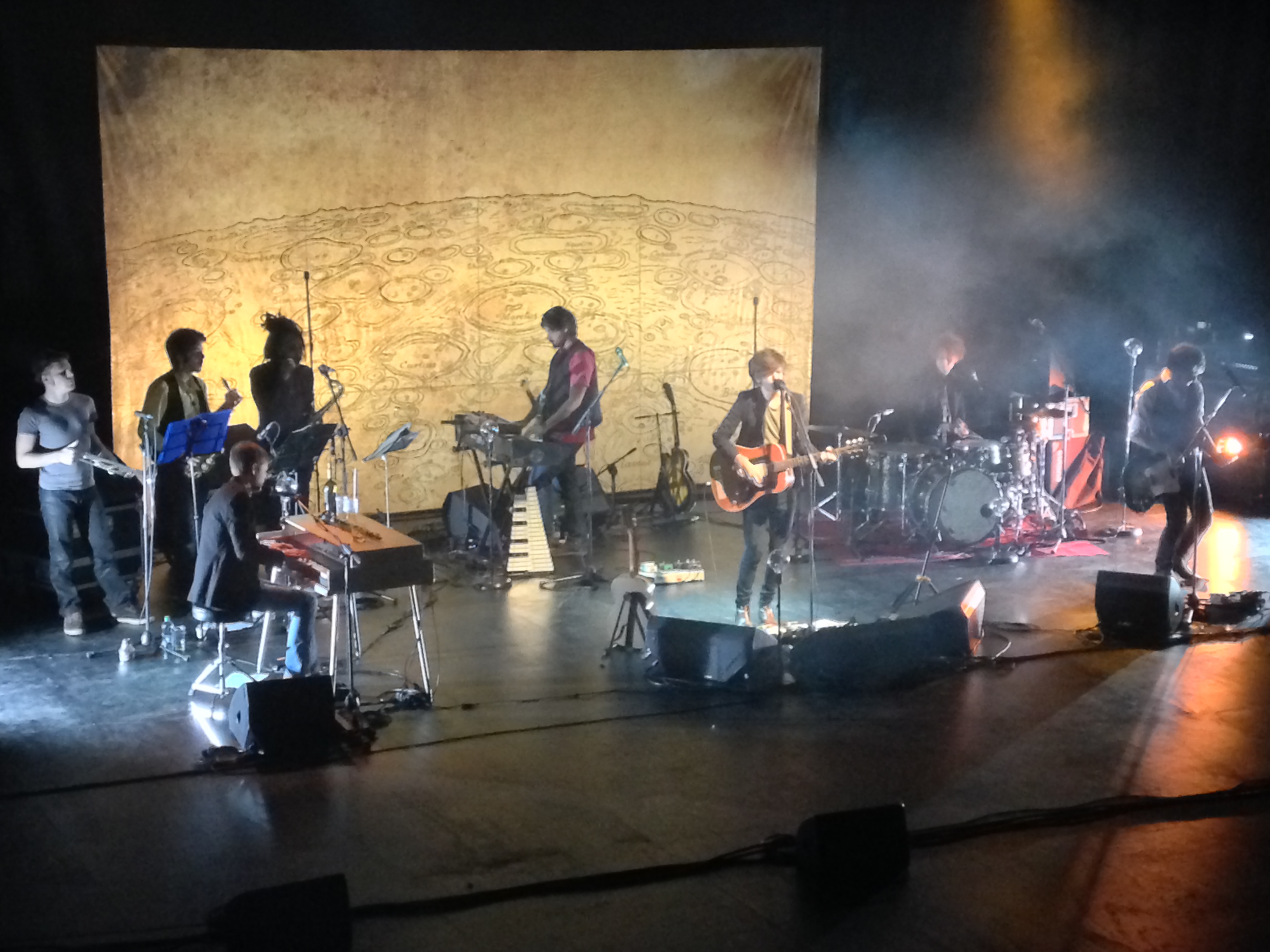 Primo pezzo in scaletta, un suo classico, “La presunta santità di Irene”, con stile e atmosfera che sono dichiaratamente quelli di “Abbracciala abbracciali abbracciati” di ‘zio’ Lucio Battisti, antitormentone di appena quarant’anni fa. Già da ‘Questa donna non è una donna…’ si capisce che il concerto sarà un successo. La conferma si ha da “Pensiero associativo”, il cui refrain viene cantato da tutto il teatro. Dente è bravissimo a coinvolgere il pubblico con i suoi dialoghi al limite del nonsense, con la erre moscia che accentua ancor di più il suo personaggio perennemente pigro e stanco, che si trova casualmente tra le mani una chitarra e la suona, tanto per far passare il tempo. Un’intesa perfetta anche con la band, che mostra di essere completamente a proprio agio nel seguire arrangiamenti ormai consolidati. Con Dente sul palco ci sono Andrea Cipelli (il Signor Solo) alle tastiere, Nicola Faimali al basso, Gianluca Gambini alla batteria, Effe Punto (chitarra elettrica, glockenspiel, tastiere varie e altre amenità), e poi la vera novità musicale di questo tour, ovvero la sezione fiati composta da Roberto Dazzan (tromba), Roberto Romano (sax tenore/flauto/clarinetto) e Alessandro Brunetta (sax alto/clarinetto/armonica).